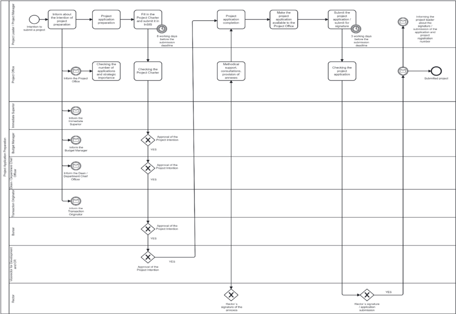 4.1 The project leader informs the Project Office immediately, their immediate superior, the relevant Transaction originator, the Budget Administrator and the Dean or the Department Chief Official, according to the department where the project is to be implemented about the intention of project preparation. If the provider limits the number of submitted project applications or the application is submitted in the de minimis regime, the Rector decides on the selection of applications for submission.