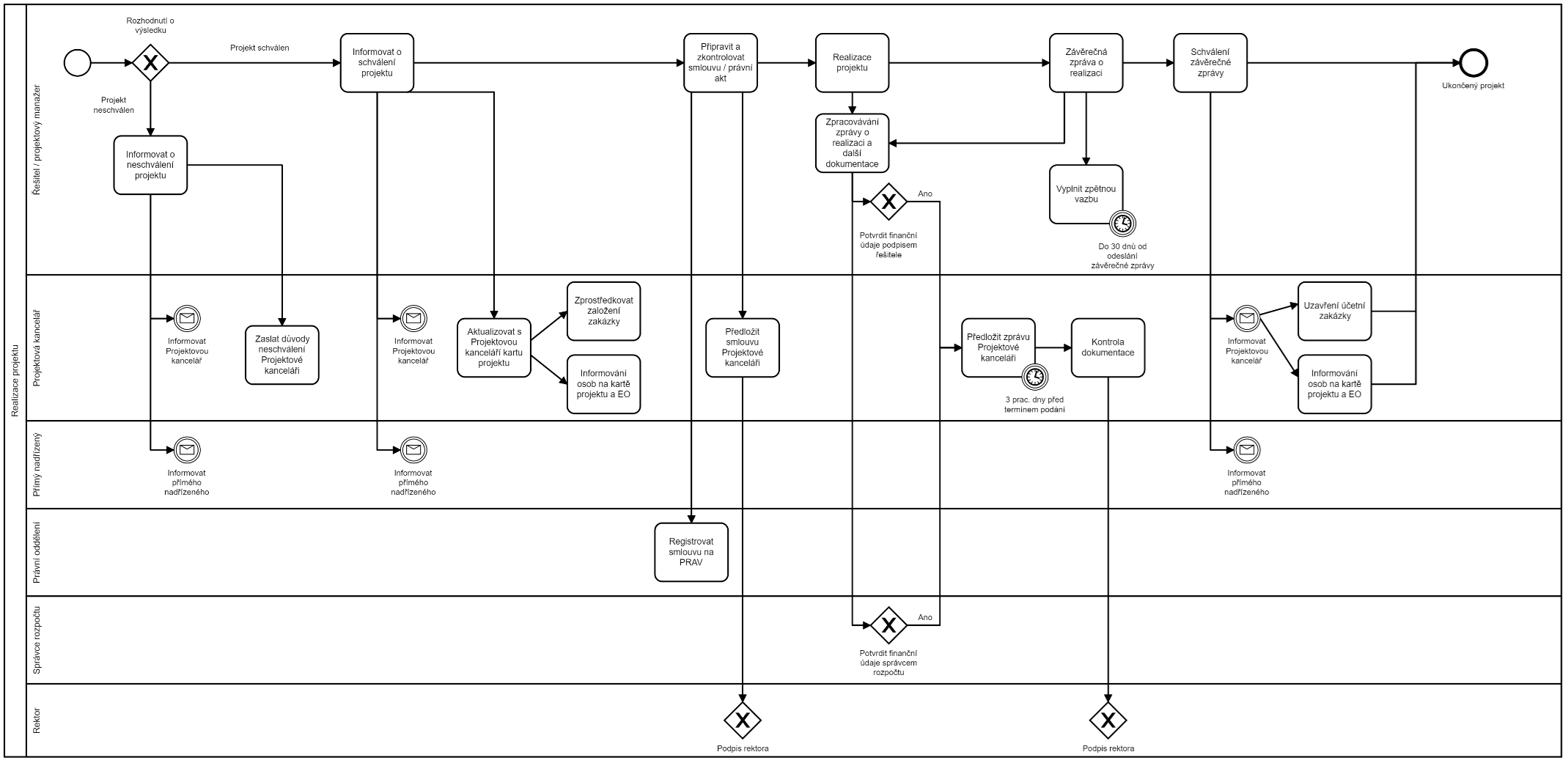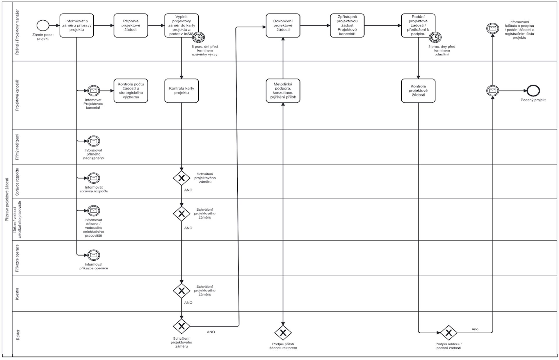 3.7 Dokumentaci, která vzniká v průběhu přípravy či realizace projektu a vyžaduje podpis rektora (např. projektová žádost včetně příloh, smlouvy, zprávy o realizaci atd.), předkládá řešitel ke schválení rektorovi prostřednictvím Projektové kanceláře. Veškerá dokumentace předkládaná poskytovateli projde před podpisem rektora formální a obsahovou/věcnou kontrolou Projektové kanceláře.